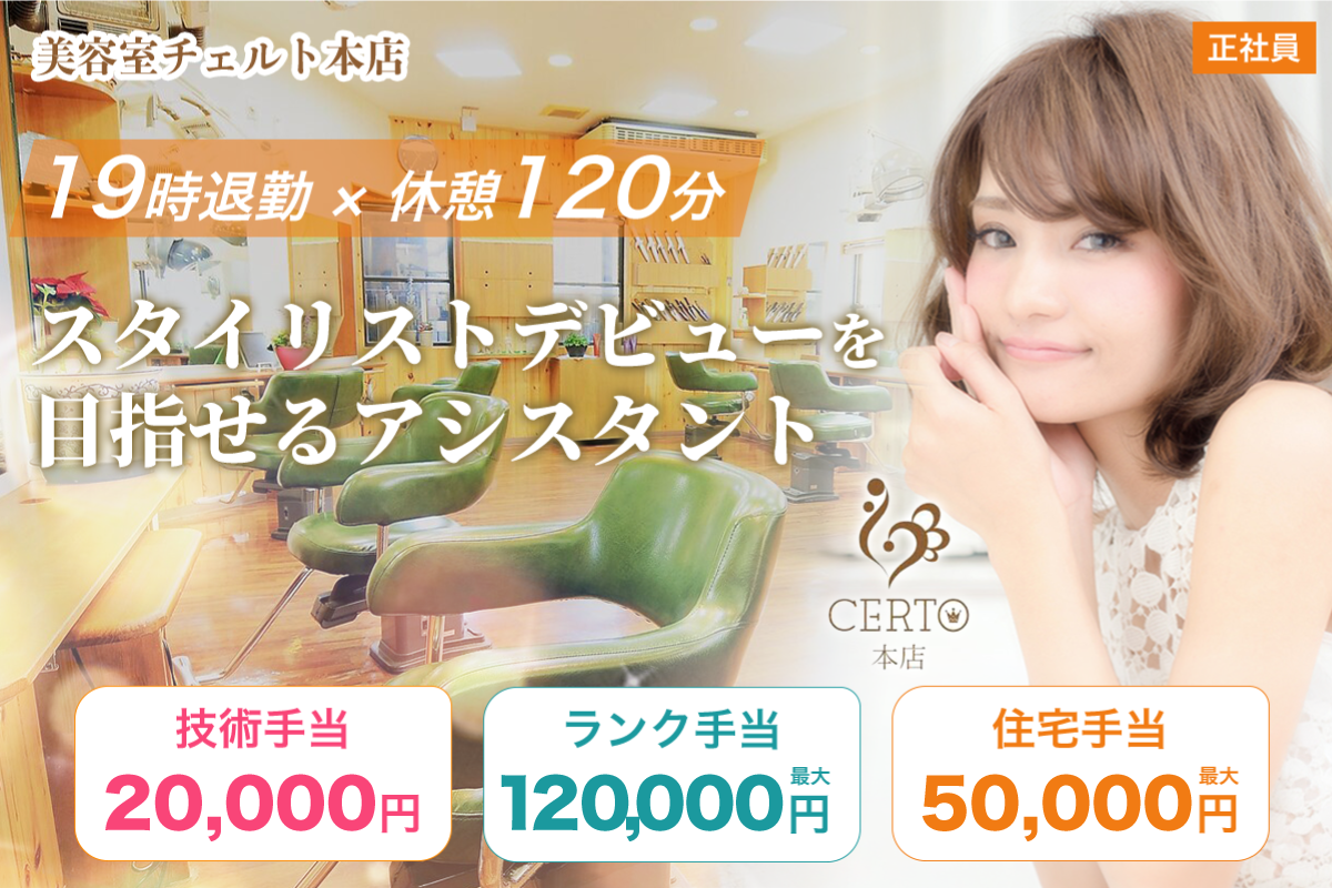 ブランクOK / 月給に上乗せ最大19万円 / 美容室チェルト本店 スタイリスト募集中 / 正社員