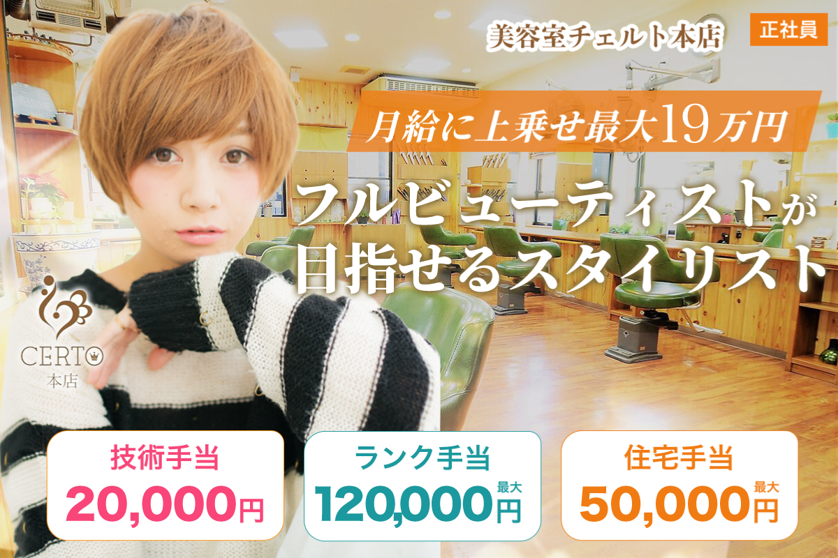 ブランクOK / 月給に上乗せ最大19万円 / 美容室チェルト本店 スタイリスト募集中 / 正社員