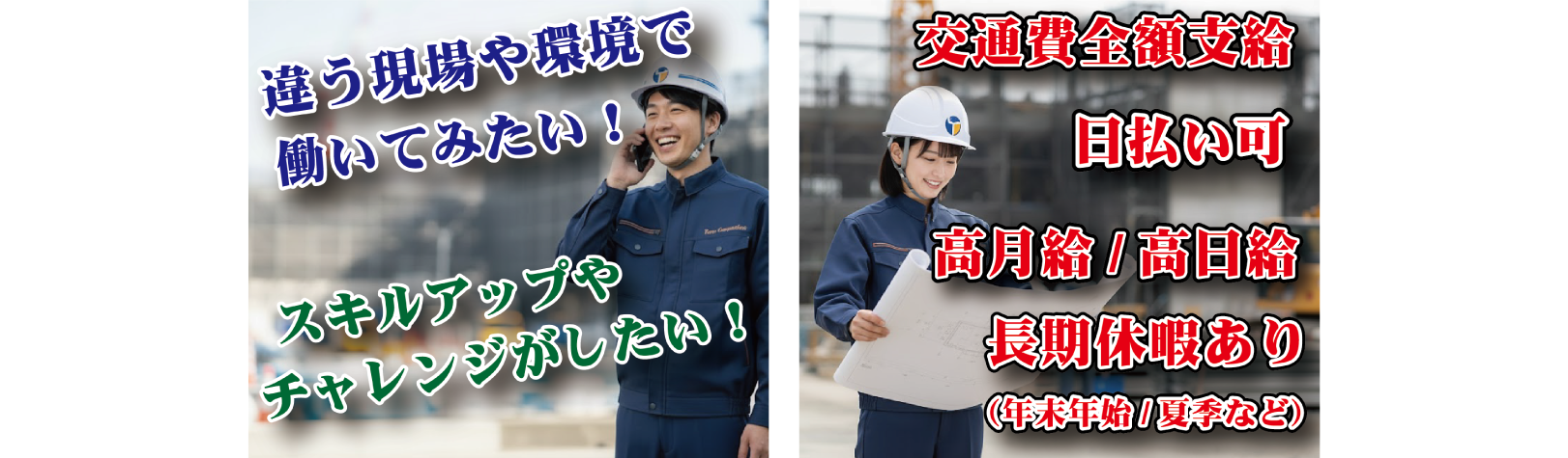 建築施工管理技士資格をお持ちの方、ブランクOK、現場作業経験がある方は積極的に採用しています!