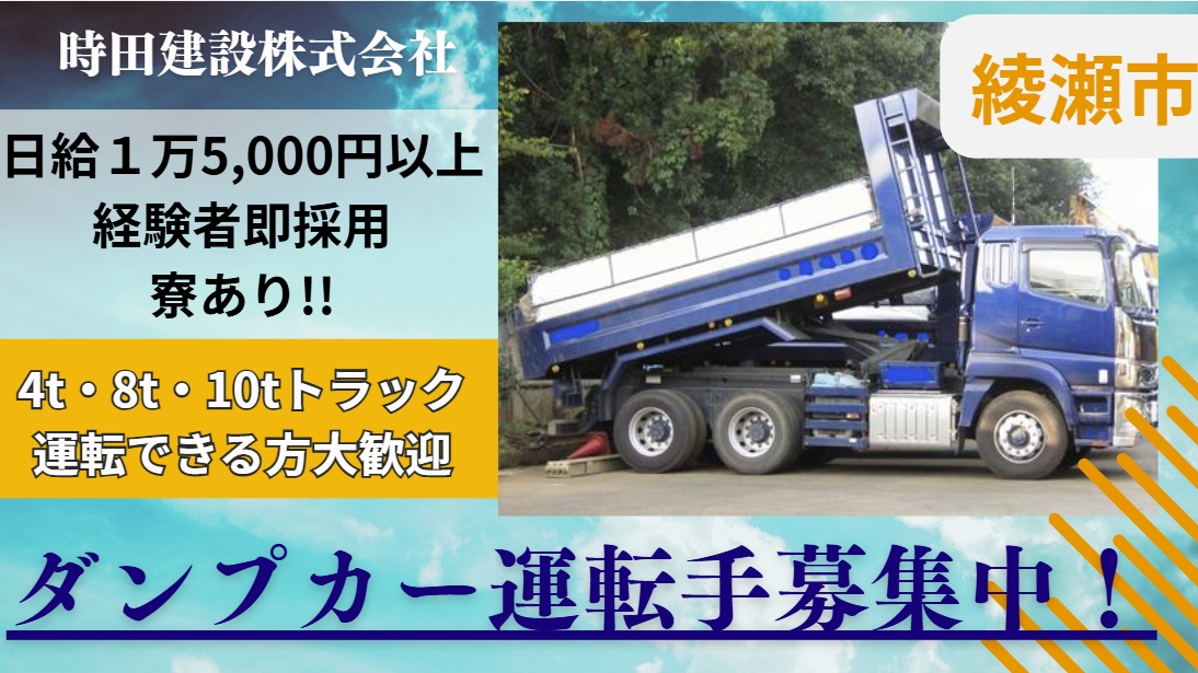 トラックの運転手募集 日給15,000円〜/寮有/現場数安定/賞与あり 時田建設株式会社