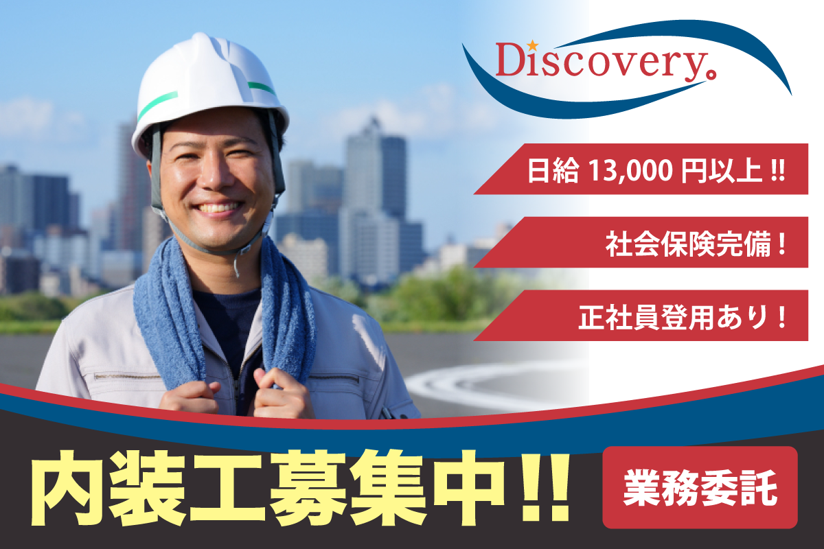 内装工募集中 日給13,000円~/寮あり/即日入居可/業務委託 株式会社Discovery