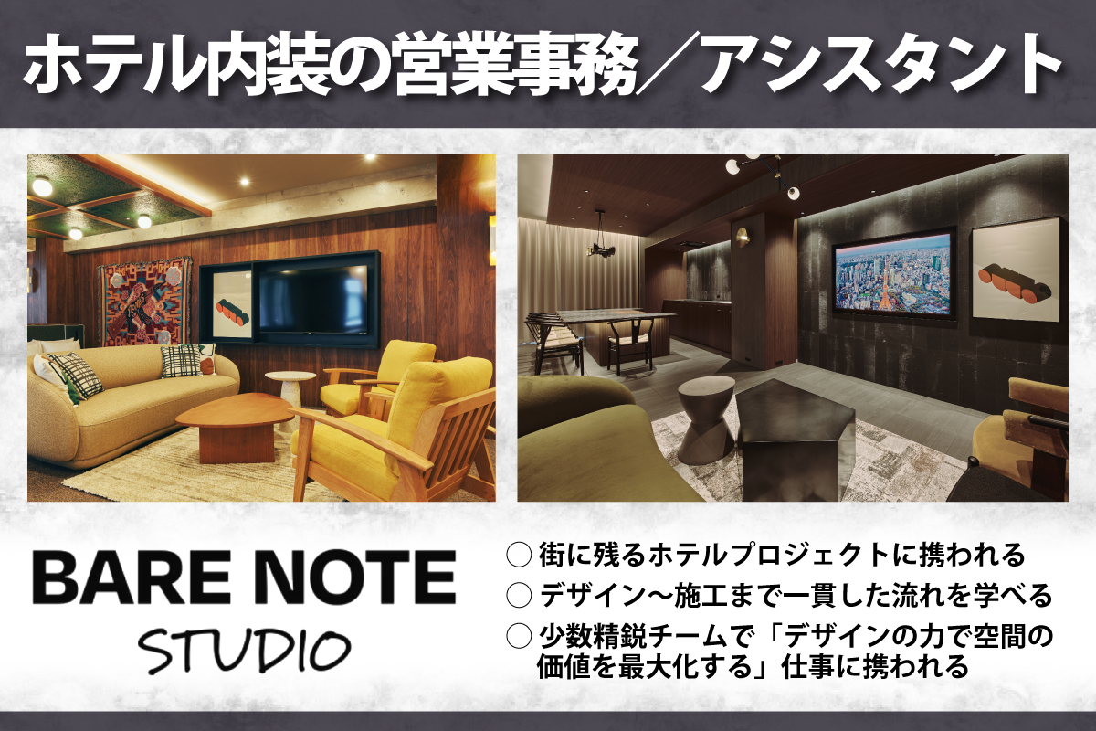 ホテル内装の営業事務/アシスタント 募集中/正社員/渋谷駅/神泉駅 株式会社BARE NOTE STUDIO