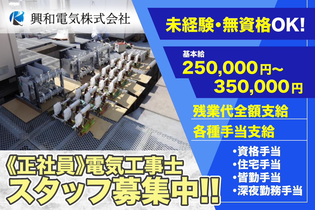 【未経験・無資格OK】興和電気株式会社 電気工事作業員募集/正社員