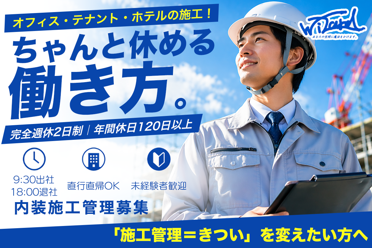 【完全週休2日・年間休日120日以上・9:30出社・18時退社で働きやすさを実現!】 対象の施工は「オフィス・テナント・ホテル」など!未経験からでも挑戦でき、安定した案件数で将来も安心◎頑張りはしっ