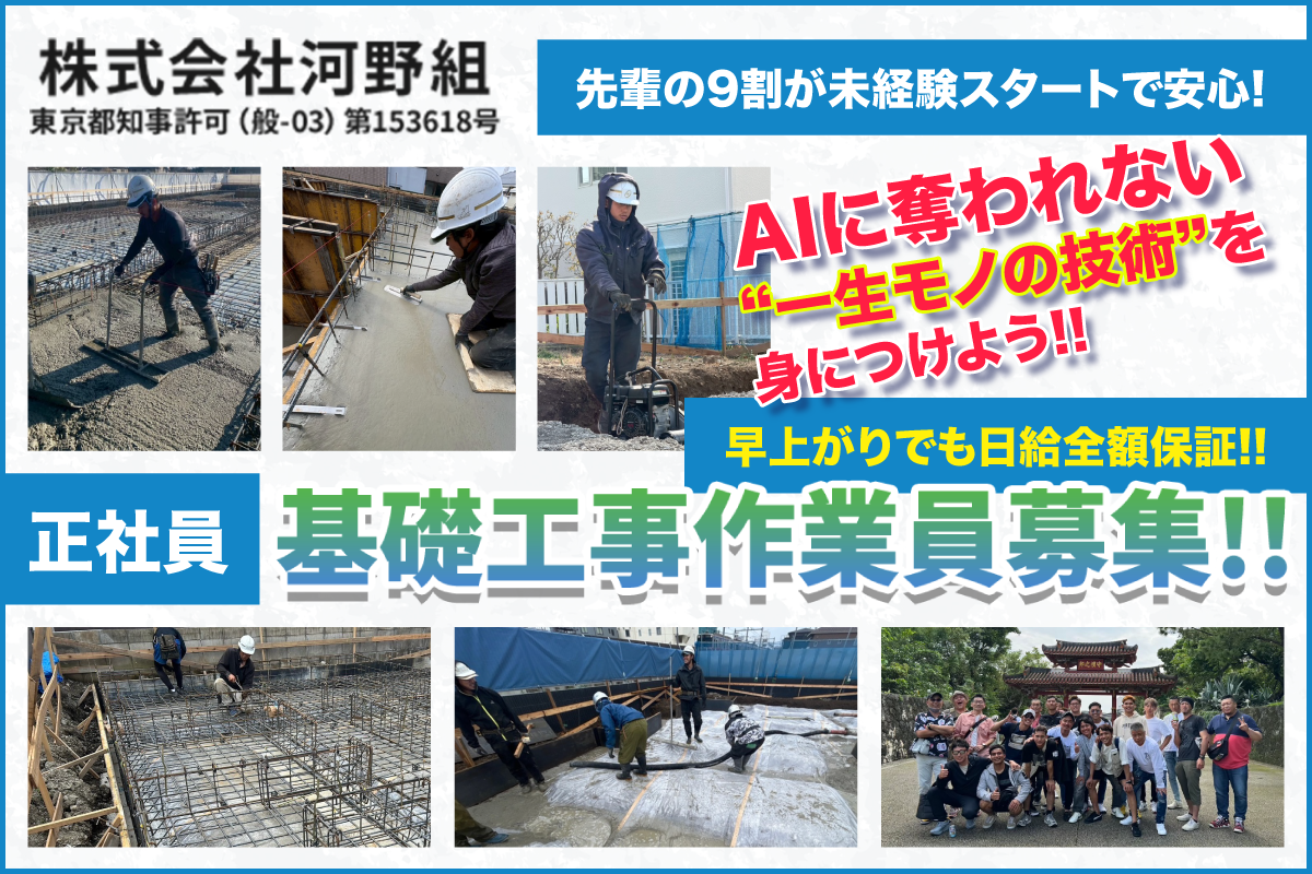 基礎工事現場作業員【株式会社河野組】早く終われば早上がり◎日給保証あり◎