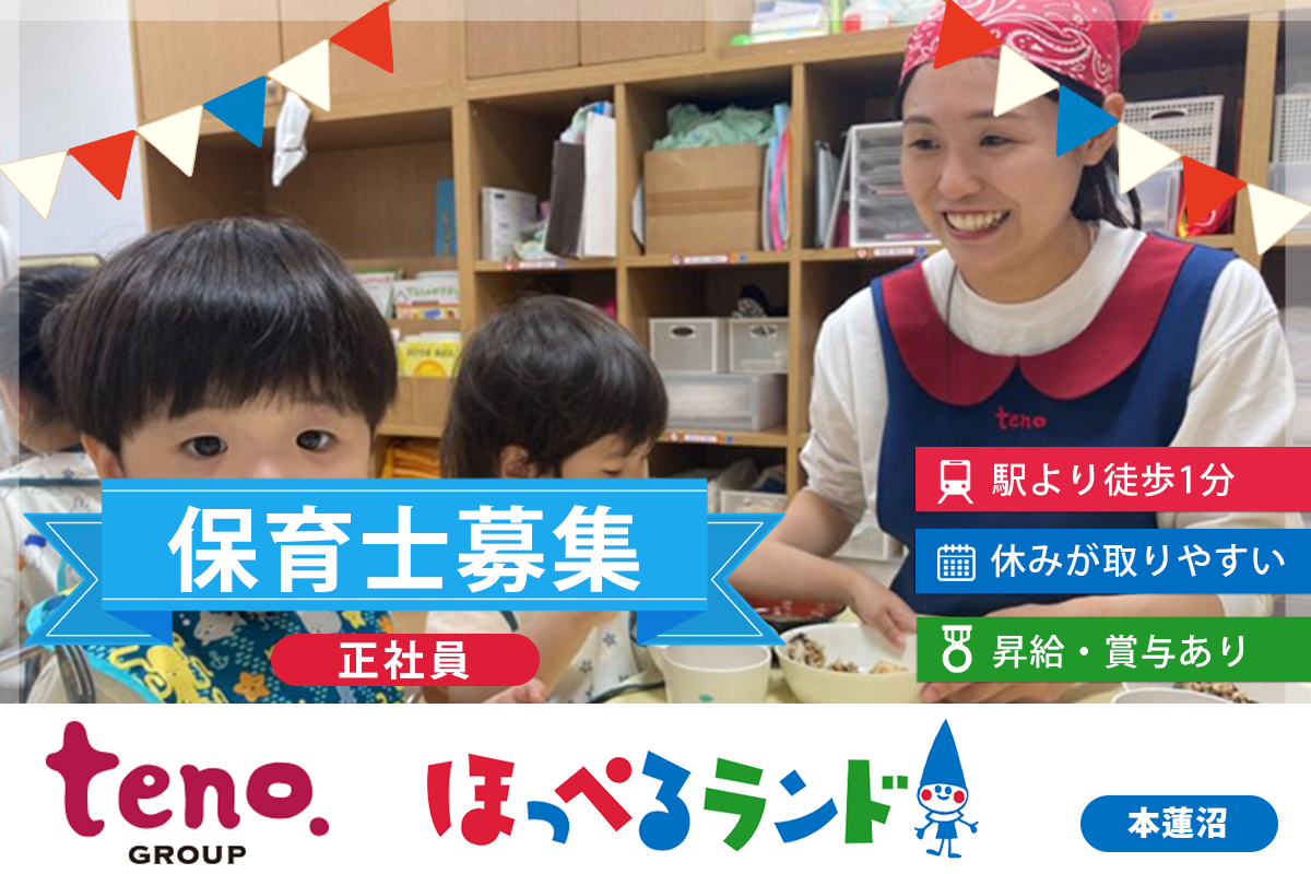 | 待遇 | 【社会保険】 労災保険 雇用保険 厚生年金 健康保険 【福利厚生・待遇】 ◆産休・育休制度 ◆看護・介護休暇、介護休業制度 ◆退職金財団加入 ◆ロッカーあり ◆更衣室、休憩室あり ◆昼食補助:園が全額負担 |