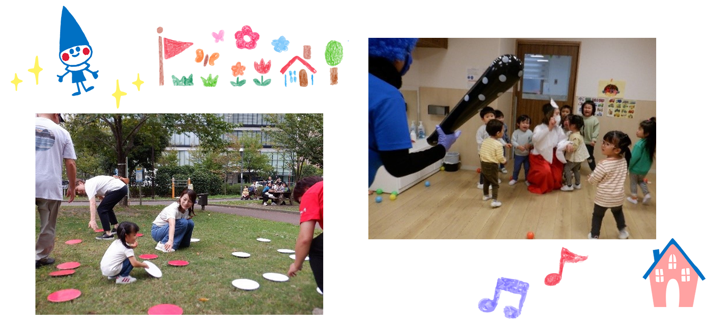 ・親子レクリエーション、夏まつり、運動会、お買い物ごっこは保護者の方にも参加してもらい、毎回好評を得ています。その他ピクニック散歩、3歳以上は遠足、七夕、クリスマス、ひなまつり、節分の豆まきは職員が鬼、園長が福の神になって子どもたちを鬼から守っています。親子レクリエーションはウォークラリーを開園の年から続けています。