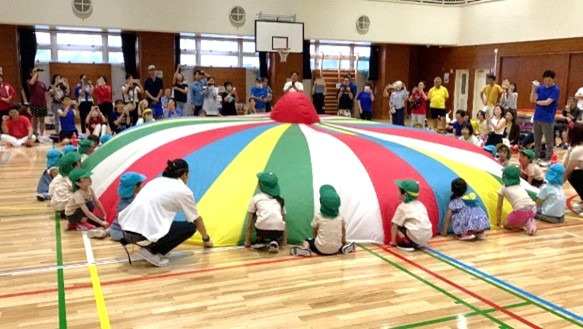 ・運動あそびの会を隣の小学校の体育館で行います。子ども達の競技だけでなく、保護者も大繩などで競い合いとても盛り上がります