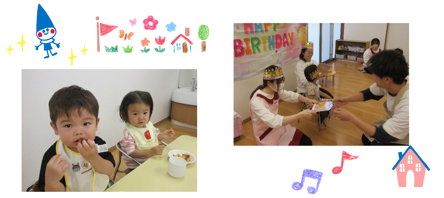 入園式、夏まつり、お月見会、ハロウィン(近隣のお店へ行く)、クリスマス会、節分の会、ひなまつり会、卒園式、