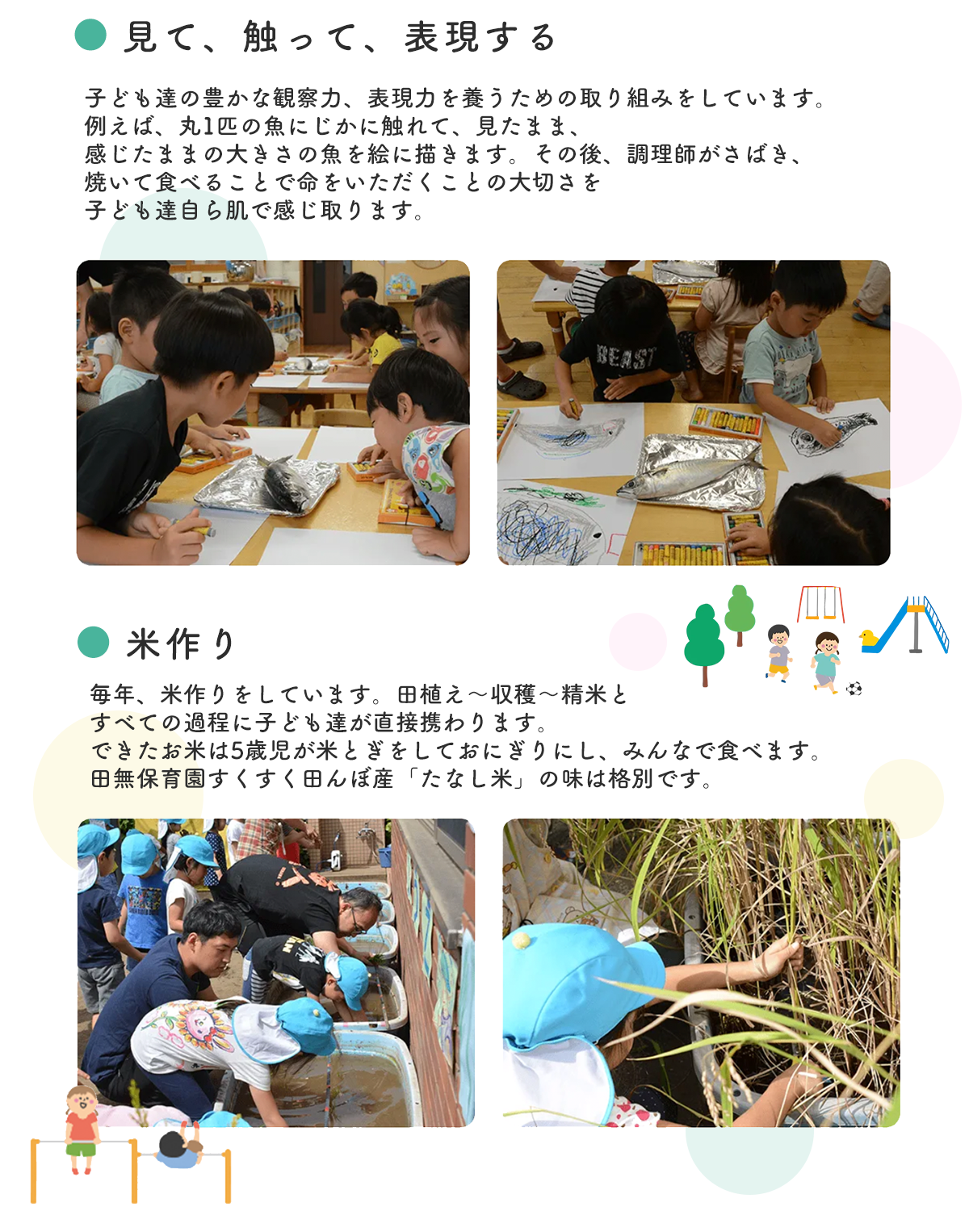 | 仕事内容 | 【職場環境】 田無保育園では、0~5歳児までの乳幼児約100名と職員50名ほどが在籍しています。 職員は各クラス3~4名ずつ配置、若手からベテランまで幅広い層のスタッフが活躍中です。 ・フォロー体制充実で安心、研修あり。 ・0 歳児クラスは、乳児:保育士=3:1 の通常割合に加えて職員を+1 名で配置。 ・保育業務全般のサポート(遊びや日常生活のサポート、行事準備の補助など) ・食事やお昼寝の見守りを中心とした子どもの安全管理 ・必要に応じて正職員保育士のサポート業務に従事 |
