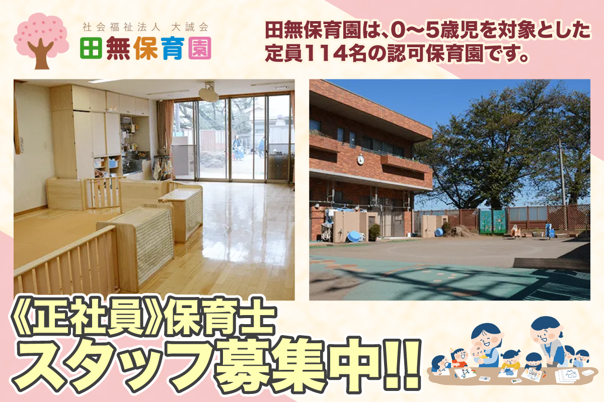 | 仕事内容 | 【職場環境】 田無保育園では、0~5歳児までの乳幼児約100名と職員50名ほどが在籍しています。 職員は各クラス3~4名ずつ配置、若手からベテランまで幅広い層のスタッフが活躍中です。 ・フォロー体制充実で安心、研修あり。 ・0 歳児クラスは、乳児:保育士=3:1 の通常割合に加えて職員を+1 名で配置。 ・保育業務全般のサポート(遊びや日常生活のサポート、行事準備の補助など) ・食事やお昼寝の見守りを中心とした子どもの安全管理 ・必要に応じて正職員保育士のサポート業務に従事 |