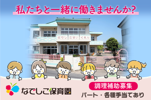 【調理補助スタッフ募集】 【法人3園で異動あり※全て熊谷市内】 子どもたちの成長を保育士同士で喜び合い支えあっています。 なでしこで一緒に楽しく元気に働いてくれる方をお待ちしています。