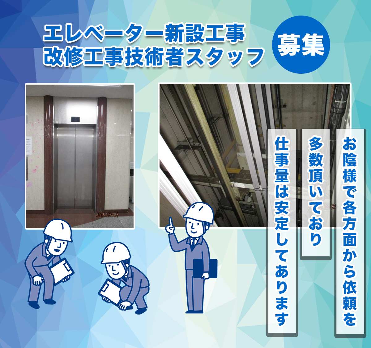 | 募集職種 | エレベーター新設工事・改修工事技術者 機械器具設置工事 |