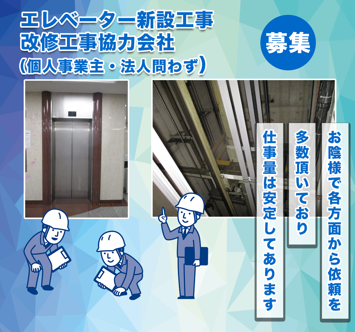 エレベーター新設工事・改修工事に携わっていただける協力会社様(法人・個人事業主) を募集しています。