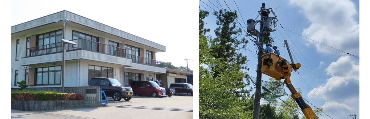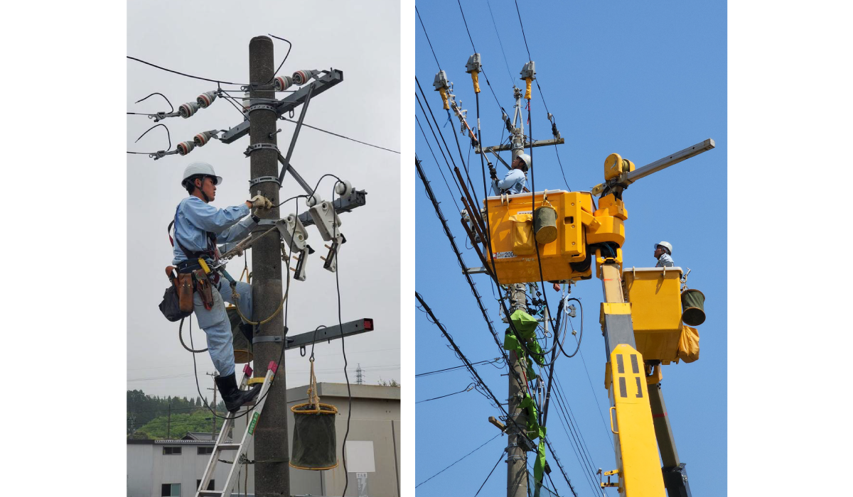 各家庭や工場に電気を送る作業で電柱を建てたり電線を引いたりする作業などをしています。
